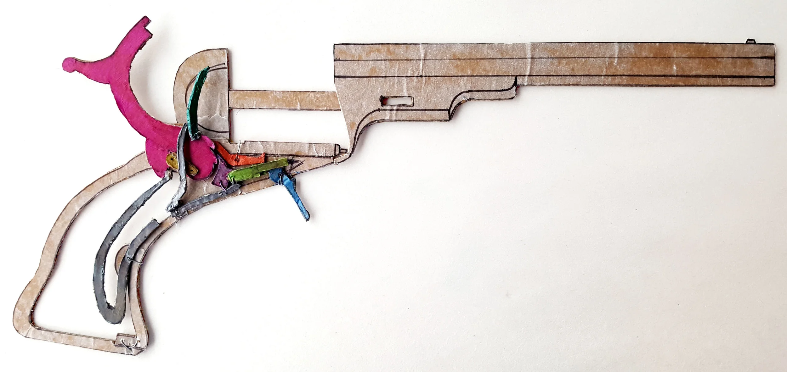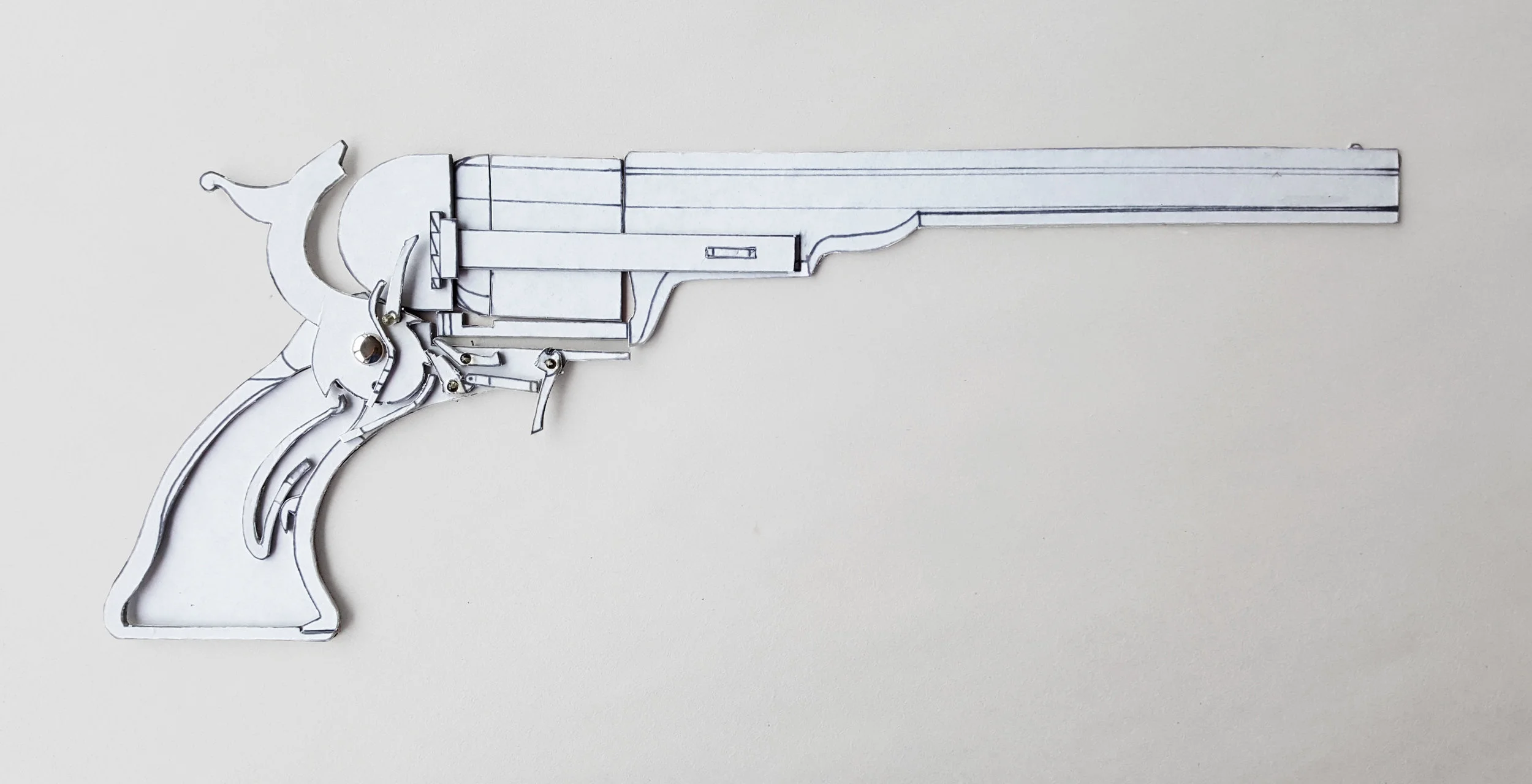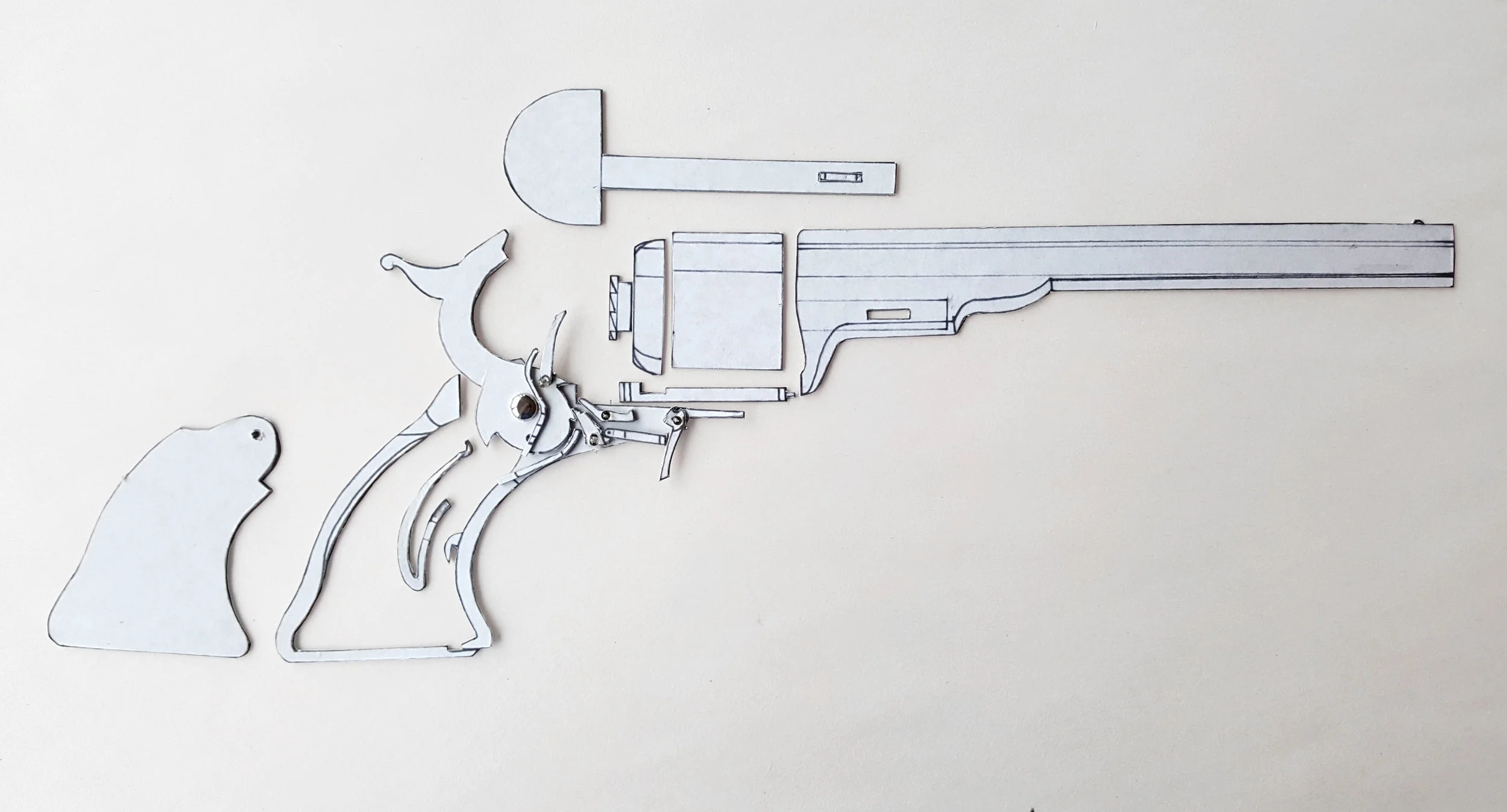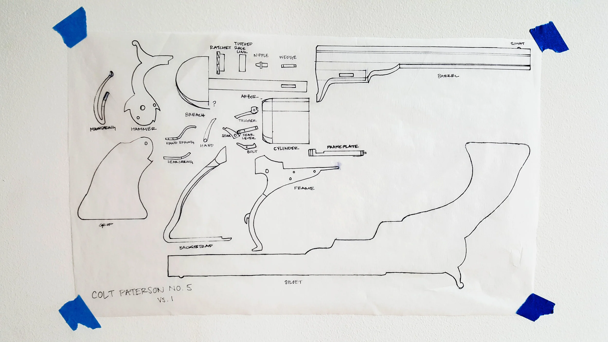 In an effort to learn more about the mechanical function of a revolver and understand how revolvers have evolved over the past two centuries, I reverse engineered the Colt Paterson No. 5 until I was able to produce a nearly functioning 2D cardboard model. While I was unable to successfully replicate the parts with 100% accuracy according to a Chicago firearms expert, I was still able to create a functioning mechanism nonetheless.