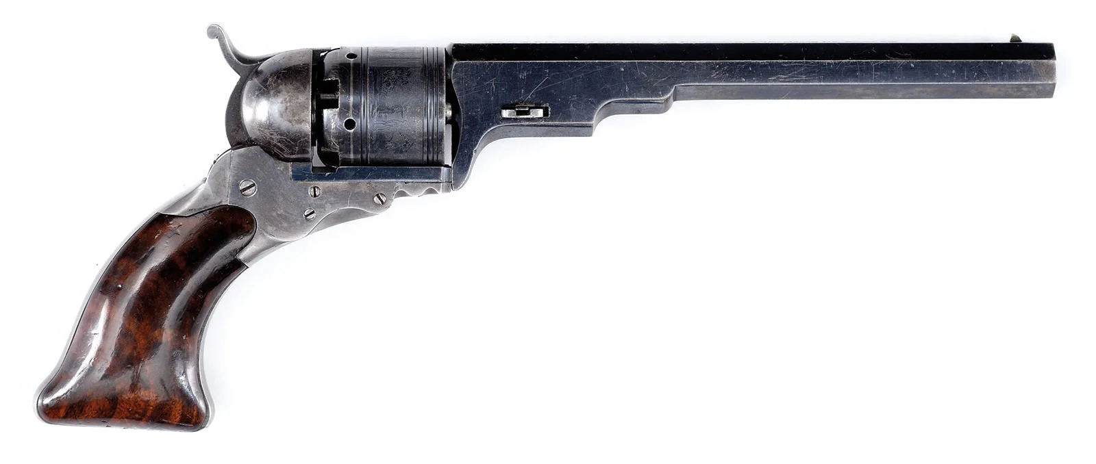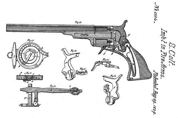 In 1836 Samuel Colt invented, designed, and produced the first rotating cylinder revolver, the Colt Paterson. In addition to being Colt’s first handgun, the Paterson was the first American mass produced revolver, a “major advancement in the development of” firearms and in interchangeable machined parts. The No. 5 was the most popular and widely used model for its use while on horseback by the Texas Rangers.